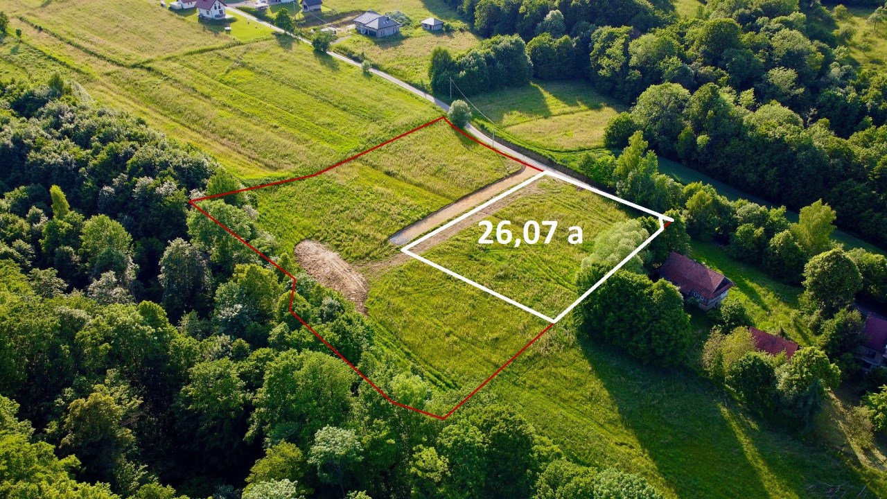 Działka podzielona na 2 mniejsze parcele (13,27 i 12,80 a), z dogodnym dojazdem wykonaną w tym roku drogą. Dojazd drogą na zasadzie służebności. Możliwe zakup poszczególnych działek lub całości.Lokalizacja i otoczenie