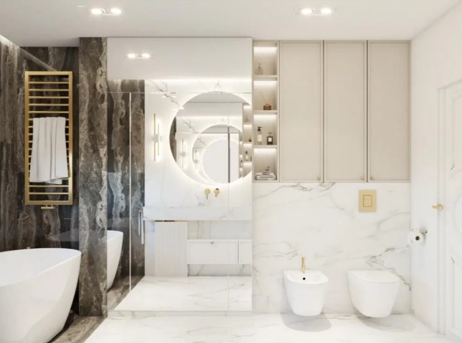 Wyposażenie łazienki | bidet, lustro, pralka, umywalka, wanna, WC |