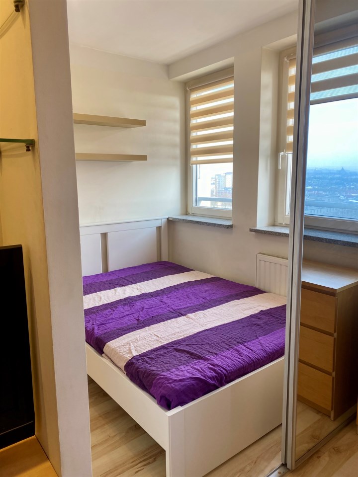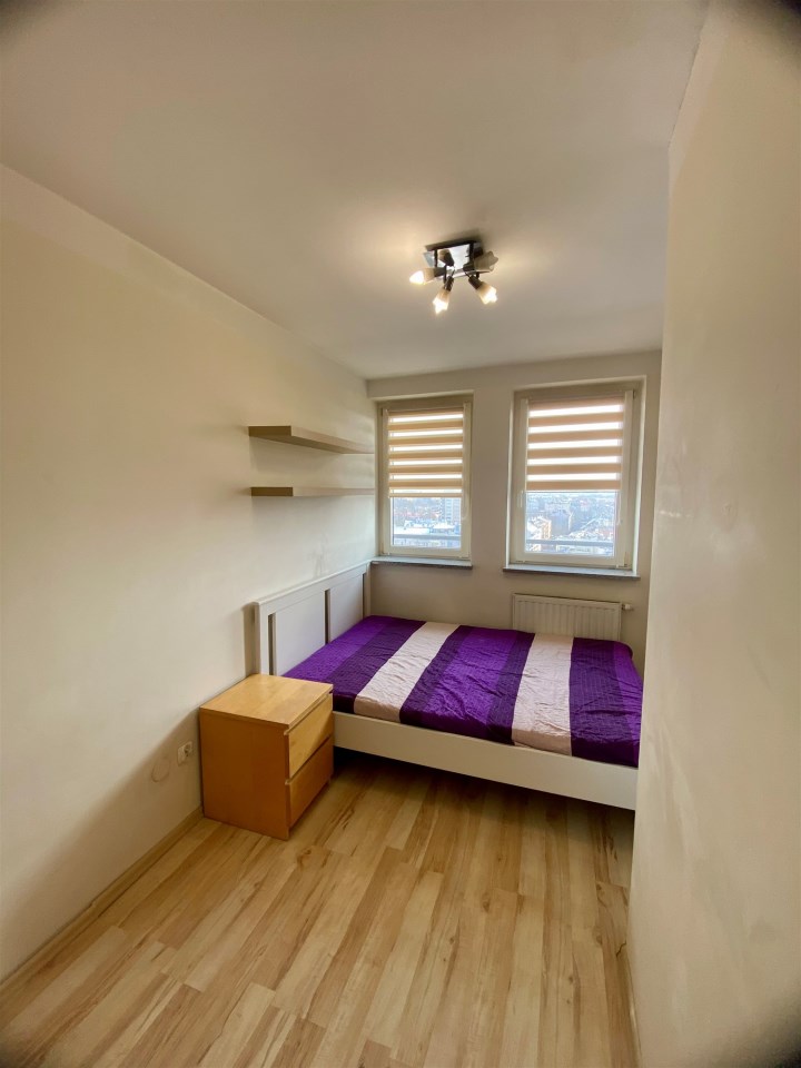 Południowa ekspozycja oraz położenie na wysokim piętrze sprawiają, że wnętrze jest bardzo jasne i ma wyraźnie miejski, nowoczesny charakter. Ogrzewanie i ciepła woda z sieci miejskiej zapewniają komfort oraz przewidywalne koszty eksploatacji.