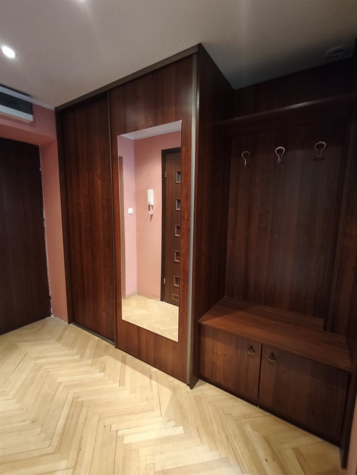 Kształt pokoju pozwala wydzielić w nim miejsce do spania, pracy i salon. Z pokoju wyjście na balkon. Kuchnia osobna, jasna z oknem, umeblowana, wyposażona w podstawowy sprzęt AGD (lodówko-zamrażarka, kuchenka, zmywarka, mikrofala, wszystkie sprzęty nowe). Łazienka połączona z wc, z prysznicem i pralką. Przedpokój z dużą zabudowaną szafą. Istnieje możliwość domeblowania na życzenie klienta.