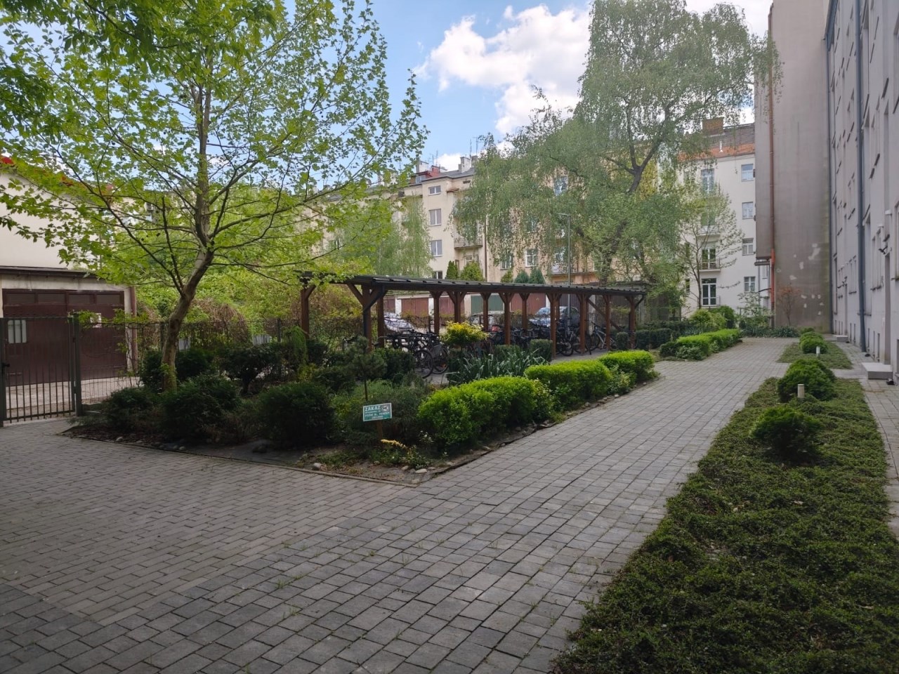 Zaciszne podwórko z wiatą rowerową, czysta klatka schodowa i domofon na kod.