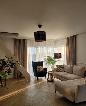- przestronnego salonu, połączonego z otwartą kuchnią, o łącznej powierzchni 33 m2, z pełną zabudową meblową, płytą indukcyjną, lodówką, piekarnikiem i okapem,