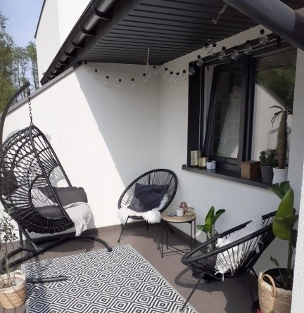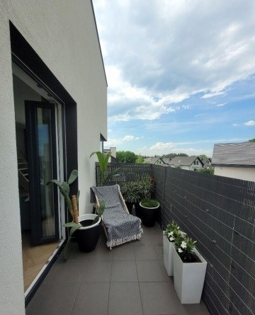 -dużego balkonu, balkon dobrze nasłoneczniony cześciowo zadaszony, posiada także gniazdko i oświetlenie, wychodzi na ogród, co zapewnia wypoczynek w ciszy.