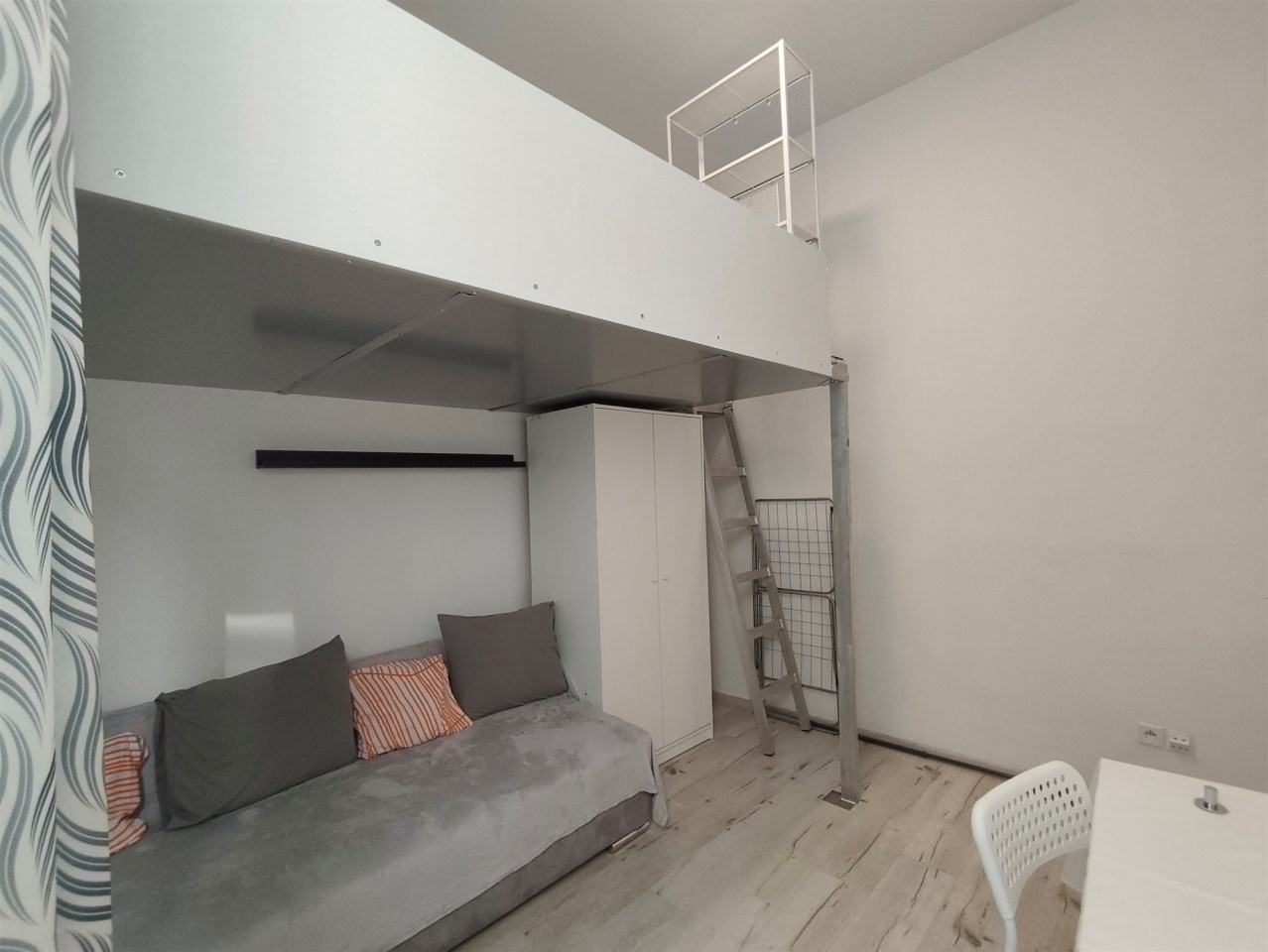 Mieszkanie ma powierzchnię 15m2, składa się z pokoju, przejściowej kuchni w przedpokoju, oraz łazienki połączonej z wc, w pokoju znajduje się mała antresola, gdzie mieści się się część sypialniana.