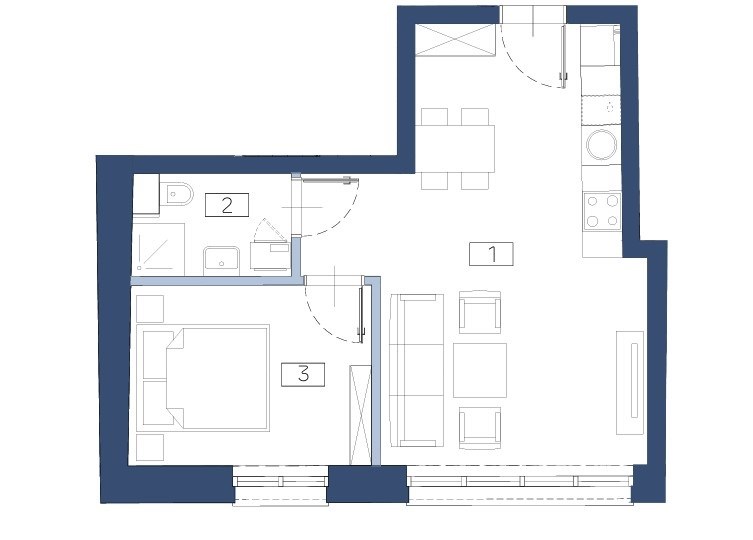 Salon połączony z otwartą kuchnią, osobna sypialnia, przedpokój, łazienka połączona z wc.