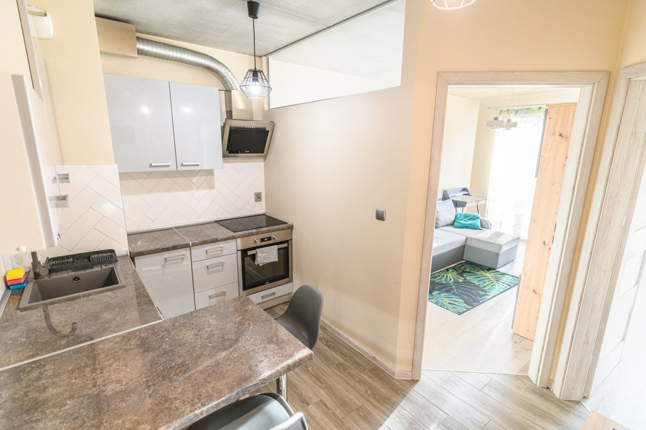 Mieszkanie wykończone wysokiej klasy materiałami z dbałością o szczegóły, umeblowane, gotowe do zamieszkania.