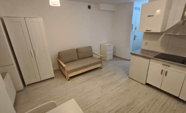 Kształt pokoju pozwala wydzielić w nim miejsce do spania, pracy i salon. Z pokoju wyjście na balkon. Kuchnia osobna, jasna z oknem, umeblowana, wyposażona w podstawowy sprzęt AGD (lodówko-zamrażarka, kuchenka, zmywarka, mikrofala, wszystkie sprzęty nowe). Łazienka połączona z wc, z prysznicem i pralką. Przedpokój z dużą zabudowaną szafą. Istnieje możliwość domeblowania na życzenie klienta.